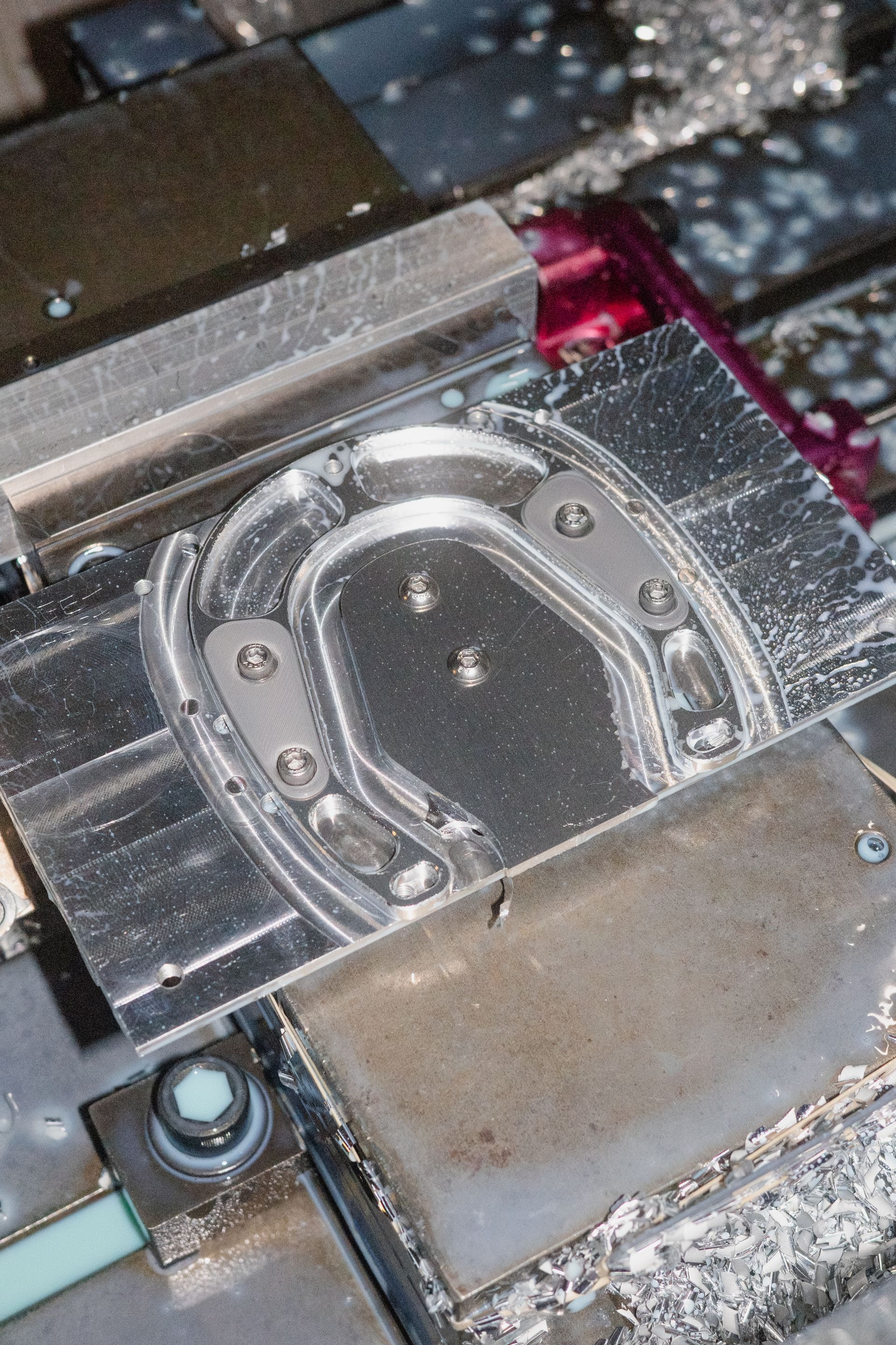 ![]() machined (from a laser cut blank) | ![]() flying into the tumbler for deburring |
